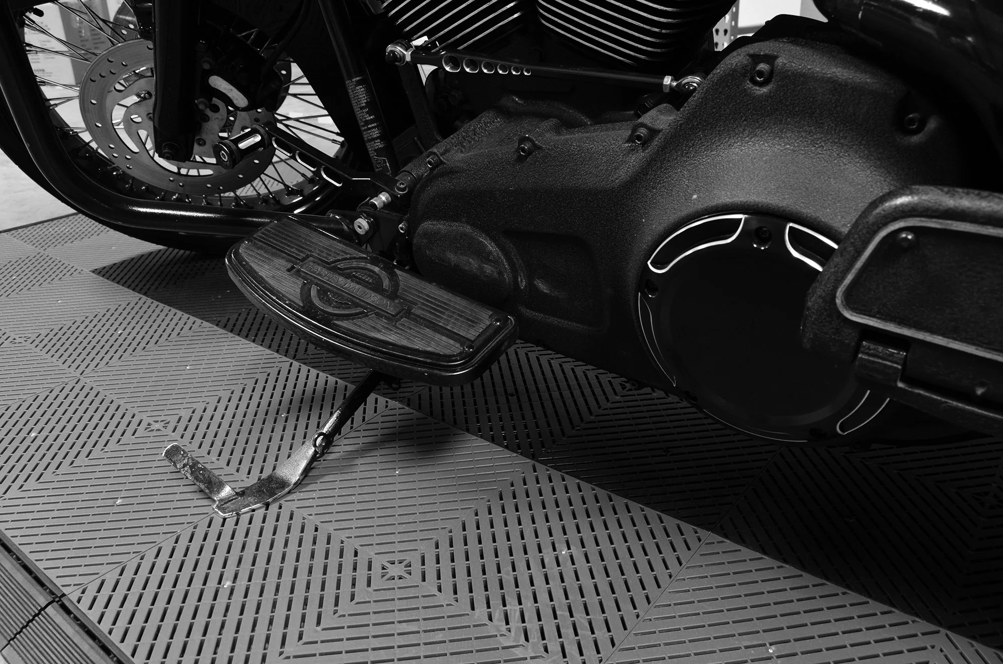 Putting together the motorcycle mat is simple. First, clean your sub floor so it is free of all dirt, grease or debris. You will interlock your tiles starting from one corner and moving to your right. After laying your first seven tiles, you will then move to the second row and begin interlocking from left to right until complete. Maintenance of interlocking tile floors is simple. Either use a shop van to pick up any debris that rests on the surface of the tile, gently mop or complete a light pressure wash.